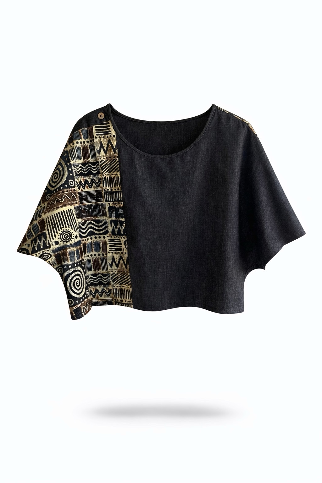 Unique denim top featuring bold tribal print panels. Designed for modern style and versatile wear — perfect with skirts, shorts, or tailored pants for creative everyday looks.
