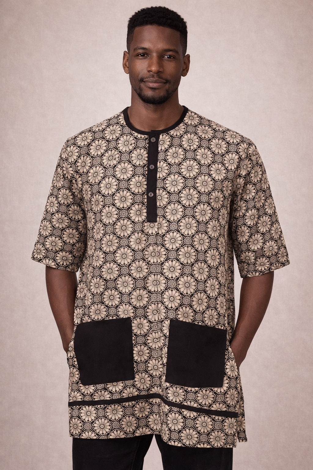 The tunic is detailed with a buttoned half-placket neckline and bold contrast pockets, adding both functionality and style. Its relaxed fit ensures comfort for all-day wear, making it perfect for casual outings, cultural events, church, or special occasions.
